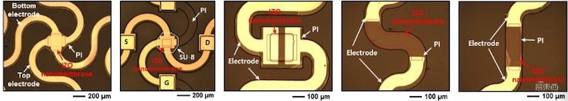 这些器件都是在低温制造过程中使用相同材料,采用光刻技术制成的结构,由50纳米厚的金导体、铟氧化锌(IZO)半导体、聚酰亚胺封装以及用于晶体管的一种称为SU-8的普通介质环氧树脂组成。