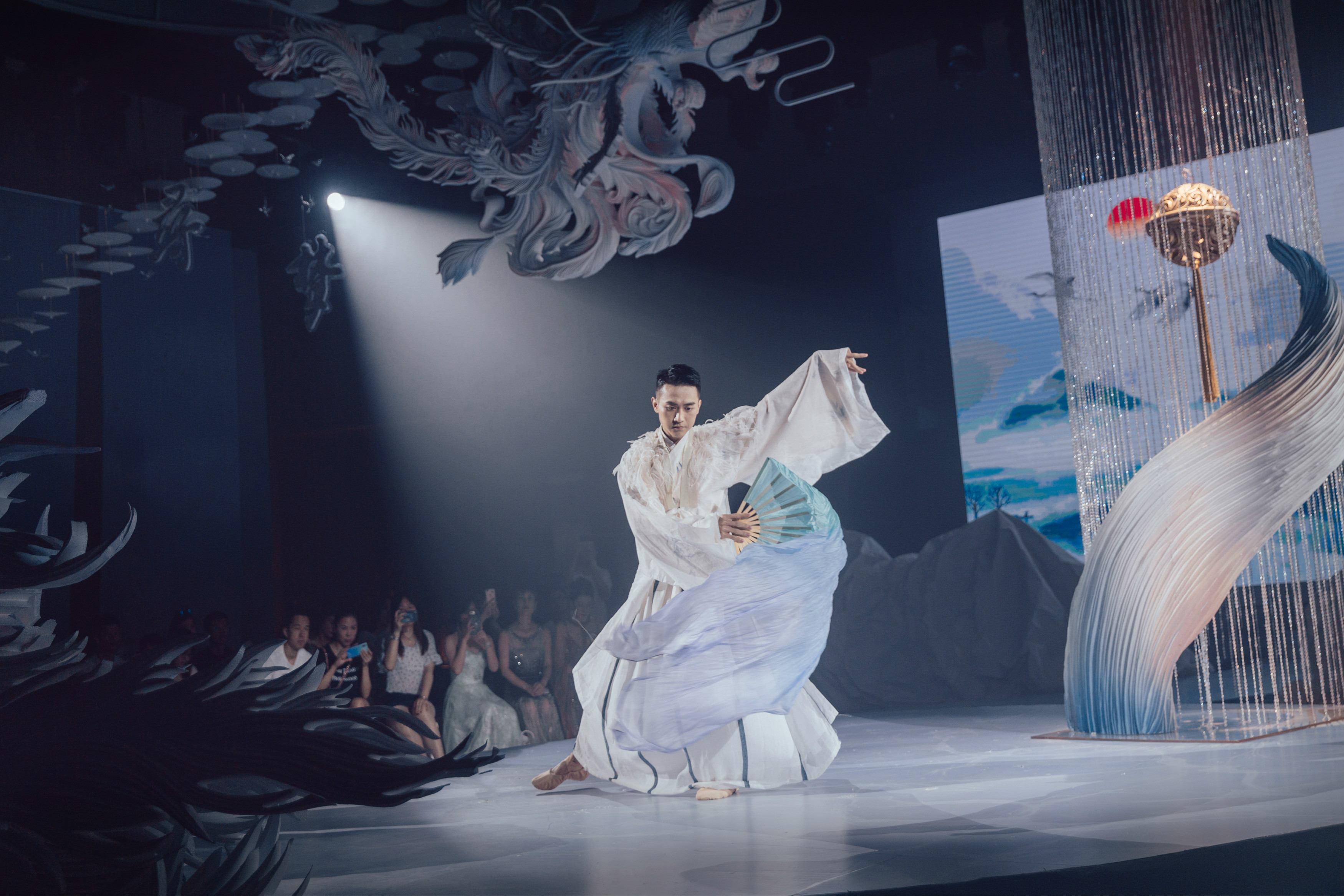 浦东香格里拉大酒店携手22HOW婚礼日志,在紫金楼三层盛事堂倾情演绎唯美新国风『闻声·寻梦』婚礼秀。酒店面积为1700平方米的盛事堂将变身为《山海经》中的神话仙境。不规则舞台与悬挂屏风将宾客环绕其中,让宾客同现场的演员一同沉浸在追爱逐梦之旅中。