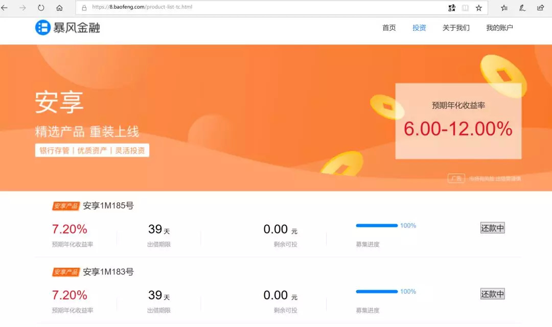 燃财经在暴风金融网站看到,网站首页显示其为“暴风集团旗下互联网金融信息平台”,其产品展示区只剩“安享”系列,介绍页面称,该产品的预期年化收益率为6%-12%。页面展示的安享理财产品共170多种,其中67种产品仍是“还款中”状态,其余100多种产品则为“已结清”。所有产品均已不可投资。