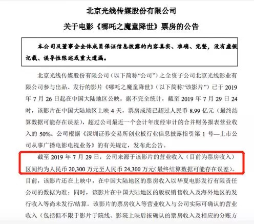 “命运”也在被影片大卖影响的,还有《哪吒》背后的上市公司光线传媒。7月30日,光线传媒发布公告称,“截至2019年7月29日,公司来源于该影片(《哪吒》)的营业收入区间约为人民币 20,300 万元至人民币 24,300 万元”,而同期《哪吒》的票房不过8.9亿。伴随着《哪吒》票房不断上涨,加之版权收入、衍生收入等,2019年光线传媒或能从该片中斩获超过10亿元的营收。