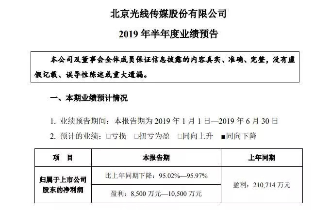 光线预告今年上半年净利润同比下滑可能会达到95%以上