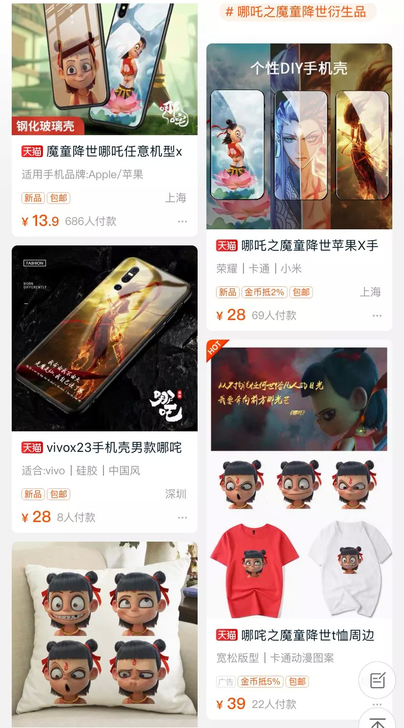 很显然,和四年前的《大圣归来》一样,片方并没有想过这部影片会大爆并提前进行衍生品布局。而有相关衍生品从业者向毒眸表示,衍生品最合适的开发时机应在电影上映前半年或更早,太晚推进只会错失热度、给盗版留空间——现如今,淘宝上已经充斥着大量盗版《哪吒》衍生品,等到正版衍生品姗姗来迟时,再想将这块收益最大化已经不太现实了。