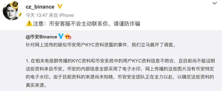 币安创始人赵长鹏转发上述微博时,未对用户信息泄漏发表言论,仅提及声明中第三条,提醒用户注意以币安客服身份致电的诈骗。