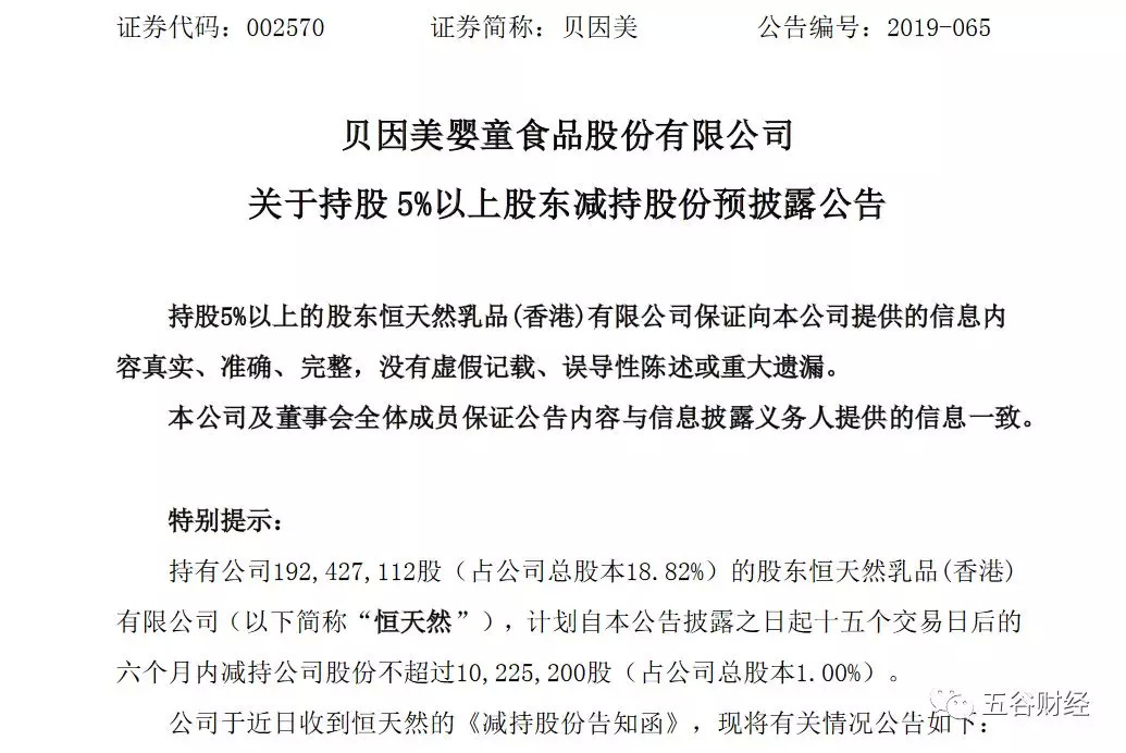《五谷财经》注意到,由于减持贝因美股票数量巨大,恒天然将通过集中竞价的方式减持,减持期间从本公告披露之日起15个交易日后的6个月内进行,减持价格根据减持时的市场价格及交易方式确定。