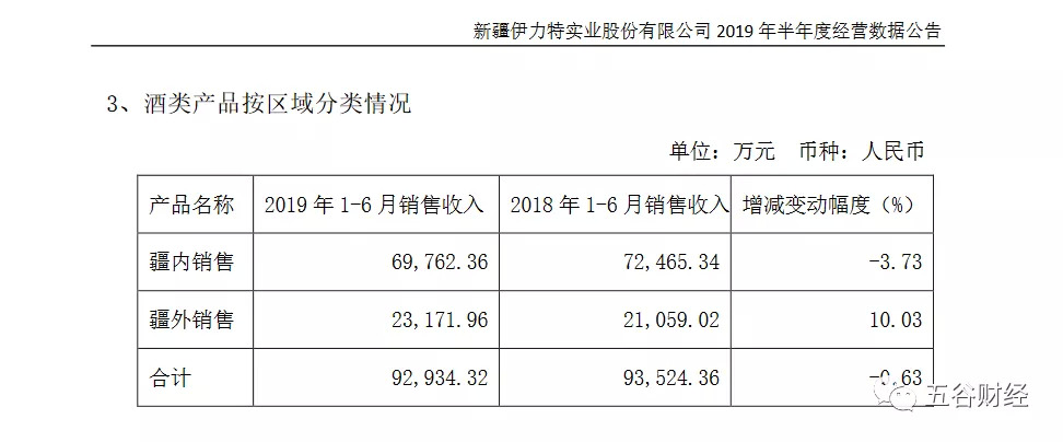 然而,数据显示,2019年上半年,伊力特疆内销售不到7亿元,与去年同期7.25亿元相比,下滑3.73%;疆外销售约为2.32亿元,与2018年上半年2.1亿元相比,增幅在10%左右。