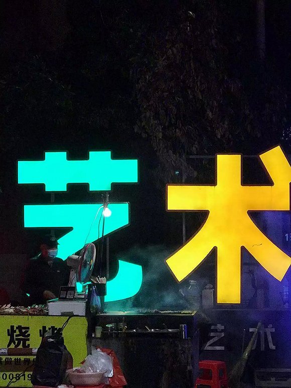 没事的时候,他会去公园写诗,招烧烤徒弟都是用文言文:有缘而承,无缘而沒,道不轻传,技不枉授。他的摊位就在源和1916艺术园区下面,每天晚上霓虹灯亮起,他就在“艺术”两个大字下面卖烧烤,张岳明最开始还想把这个画面做成海报。