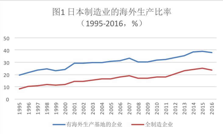正如上图所示,在日本陷入失去的二十年、经济长期停滞的背景下,日本制造业的海外生产比率持续攀升。