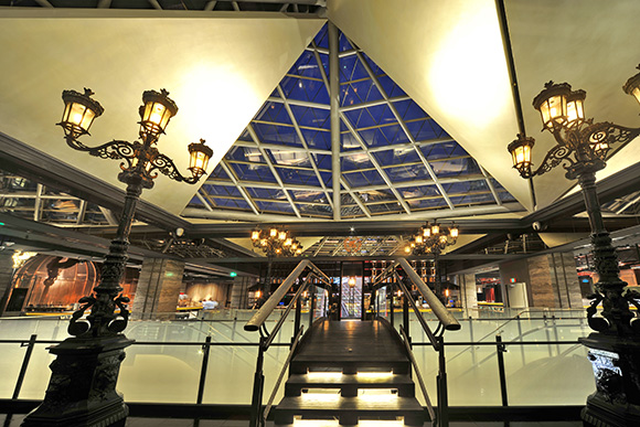考虑到引导客流,新光天地在最高的7层设定为优质餐饮区,主题为“苏州遇见威尼斯”。整层空间被设计成威尼斯广场和苏州老城的结合,走过位于中央的威尼斯小桥就能看到布置成苏州老集市的食肆。除了苏帮特色菜餐厅新梅华与顾小亭茶餐厅,新光天地还引进意大利第一家咖啡店Caffé Florian。