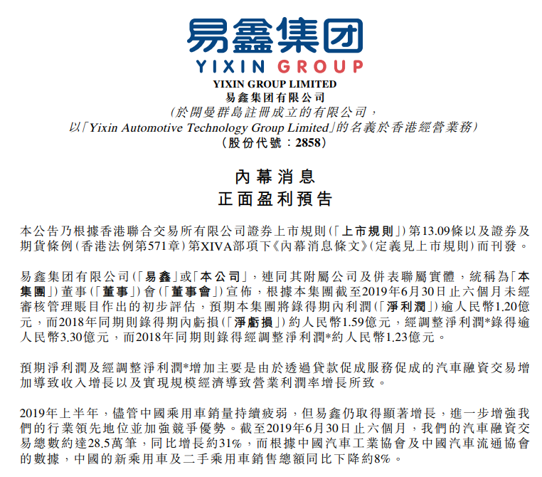 8月7日,国内汽车金融交易平台易鑫集团(02858.HK)发布2019年上半年业绩盈利预告,公司预期2019年上半年净利超过1.2亿元,实现扭亏为盈。 经调整净利润超过3.3亿元,同比增长超过160%。