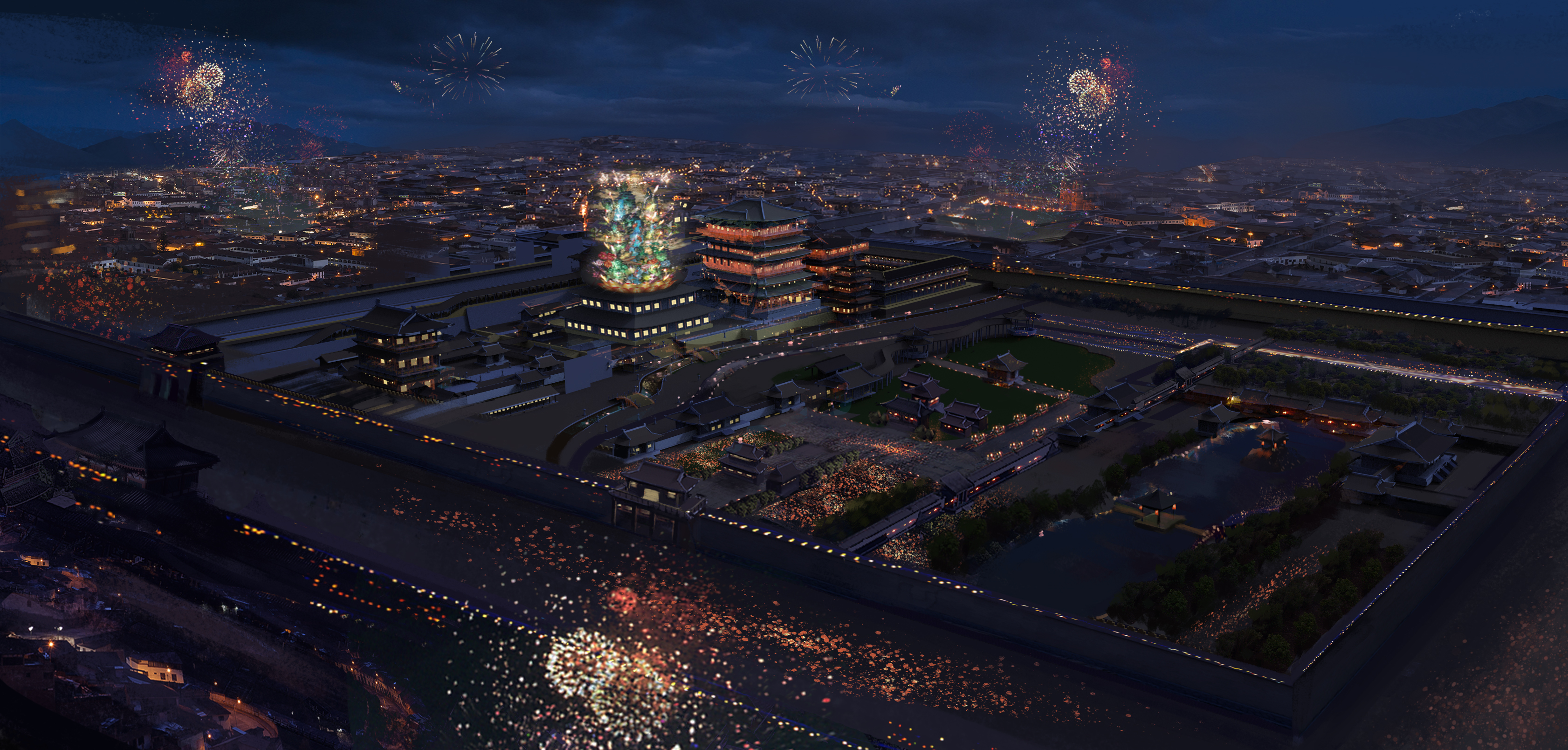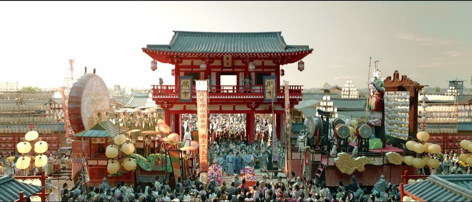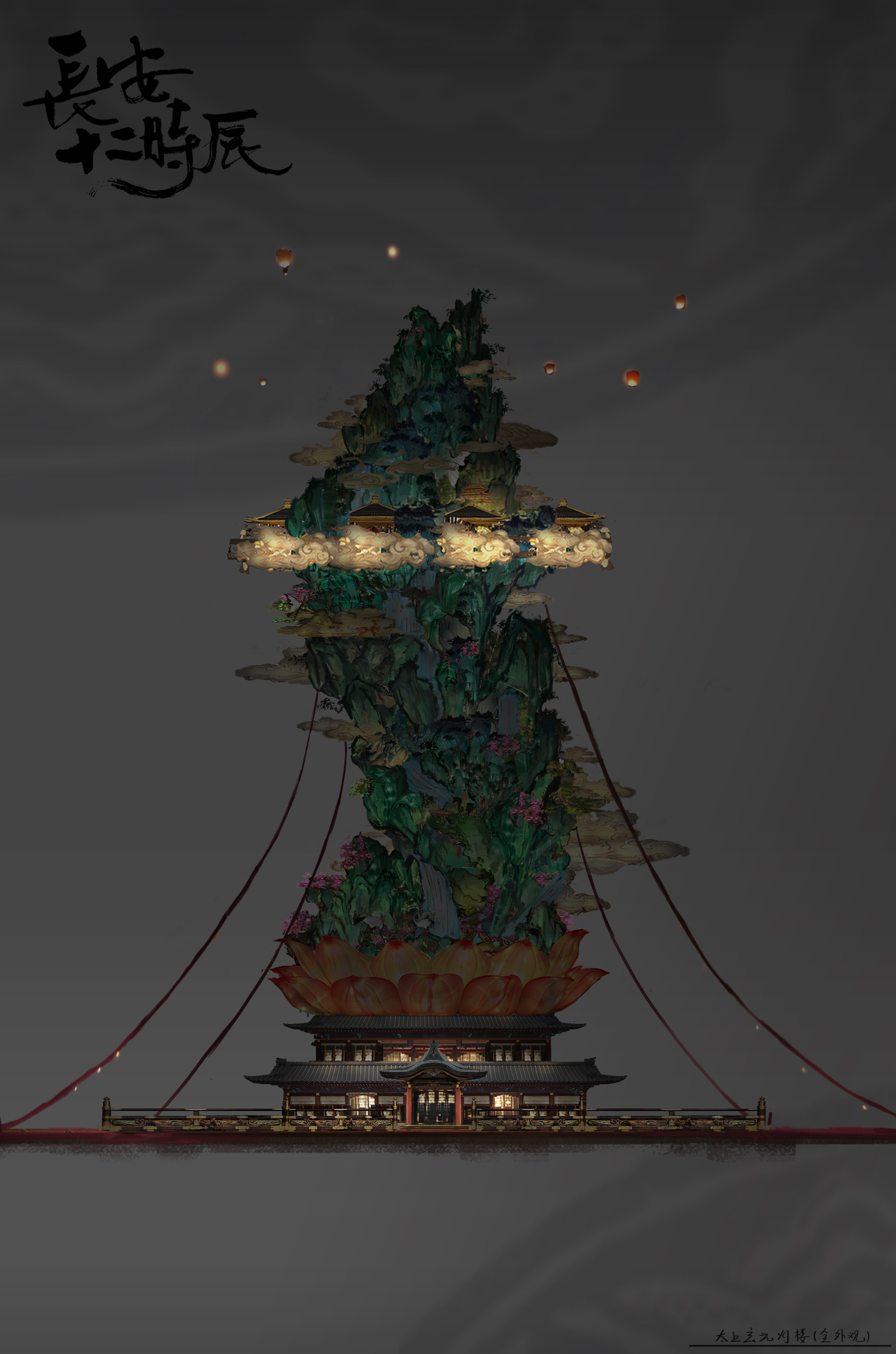 以剧中多次出现的大仙灯为例,这个建筑的设计贯穿了整个制作过程。最早的草图是金杨刚进组看完剧本就画好的,用了不到一周时间,也得到了导演的认同。大仙灯是献给唐玄宗的礼物,代表着上元节灯会的高潮,但这个灯是马伯庸想象出来的,没有任何可供参考的资料,美术团队只能自己展开设计。金杨当时就想,原著里大仙灯在花萼楼对面,唐玄宗可以在楼顶凭栏远望,既然花萼楼已经是一座楼了,旁边再建一个常规的楼是不是有点重复?他们于是决定把大仙灯做成一座仙山的形状。山什么形状最好看?里面有什么?出现什么样的机关又不乱又好玩?之后,他们又花了很长时间丰富这座仙山。