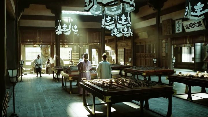 按照这样的设定,美术设计就有了比较合理的前提。殿很高大,可以容纳很多元素,正如我们在剧中看到的,靖安司里既有神像的肃杀,也展示了李必领导下一群文官紧锣密鼓的工作状态,形成一种奇妙的气氛。而靖安司的职能区域划分和原本建筑道观设定的综合,决定了整体色调沉稳庄重,也在色彩上和宫廷的鲜亮形成对比。