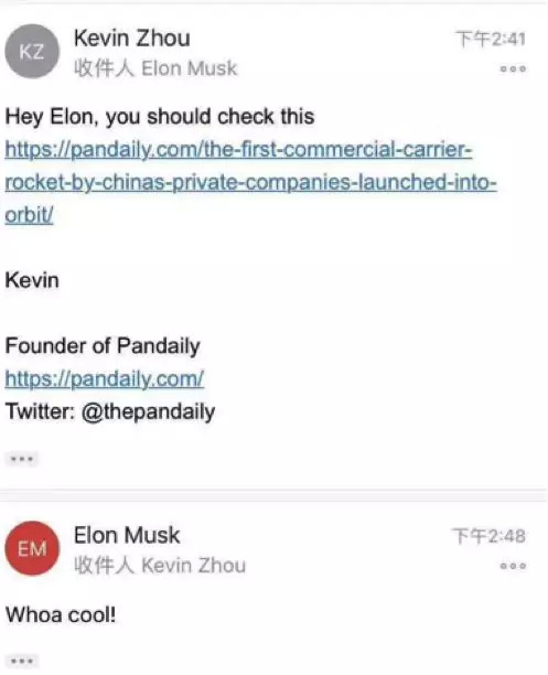 双曲线一号入轨后的一个小时,Space X 创始人埃隆.马斯克在给媒体的回复邮件中惊叹“Whoa cool!”。