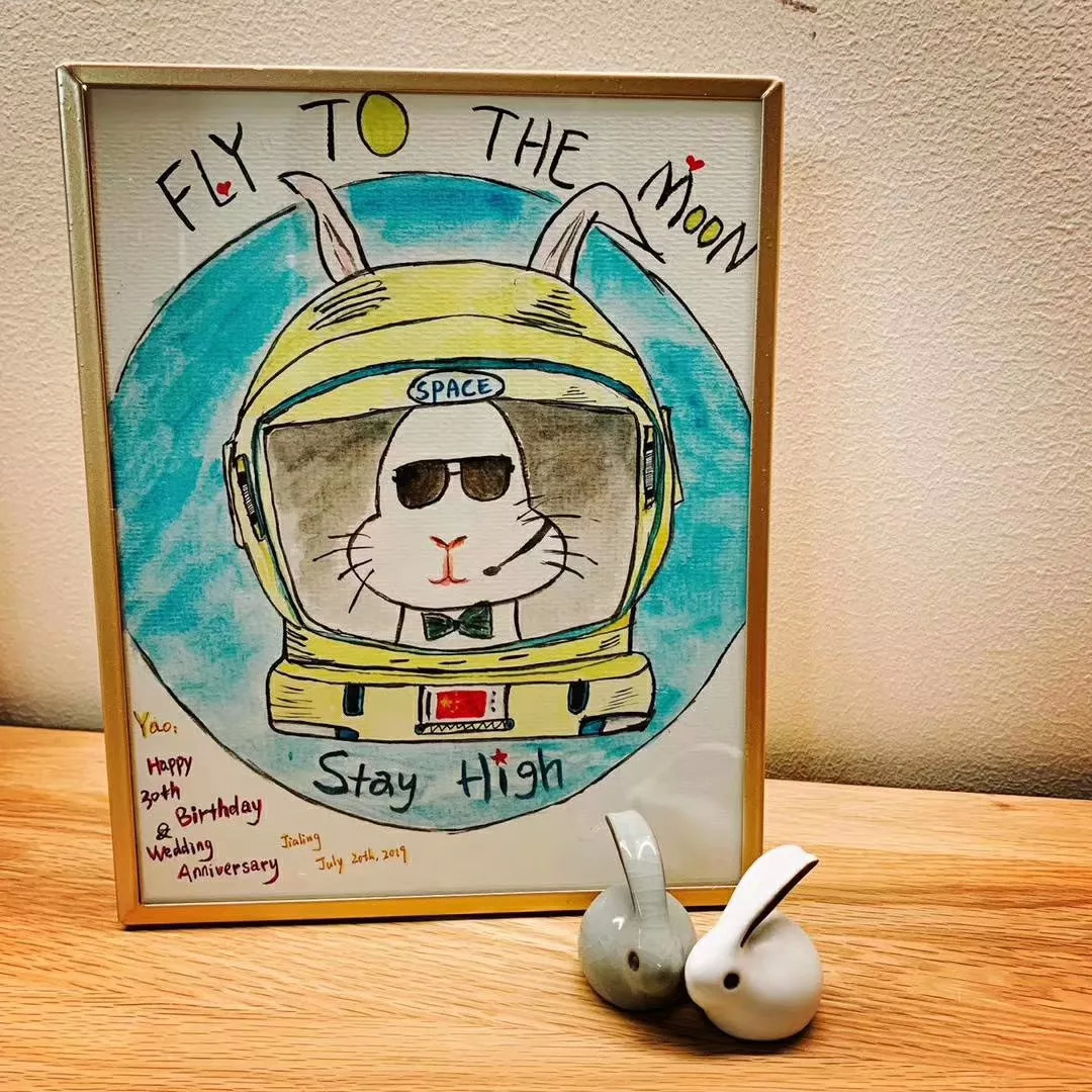 双曲线一号发射前5天,姚博文刚过完30岁生日。妻子为他画了一幅“兔子宇航员”肖像作为生日礼物,用英语标注了对他的美好祝愿——FLY TO THE MOON。