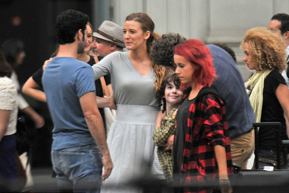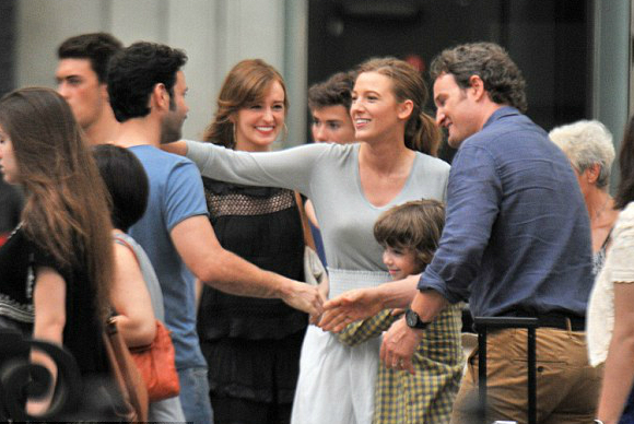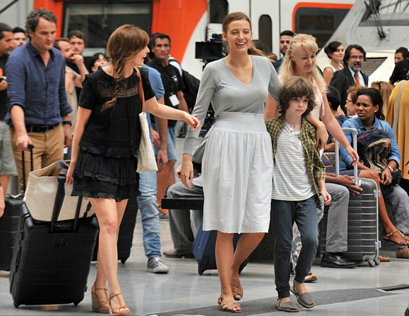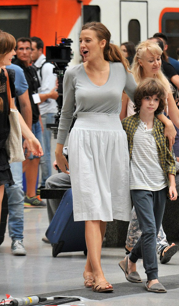 布莱克正在拍摄繁忙火车站的电影场景。她的手臂环抱着年轻演员,杰森在后面拖着行李箱。