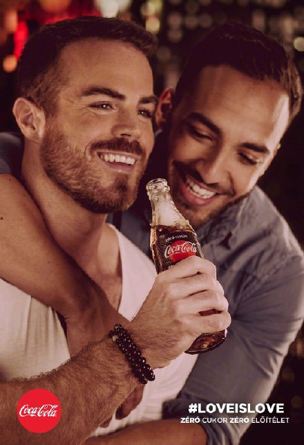 可口可乐就中了招。最近它在匈牙利投放的一波大规模的品牌活动,在布达佩斯深受年轻人欢迎的Sziget音乐节期间,配合音乐节“爱情革命”的主题,喊出了“平等爱(equal love)”的口号,描绘了同性伴侣享受零糖可乐的场景——“零糖,零偏见”。不仅有线下户外广告,也有以#loveislove(爱就是爱)为话题标签大规模的社交网站投放。