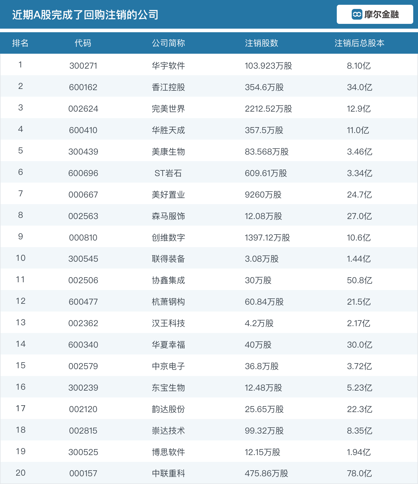 下面是近期A股完成了回购注销的公司名单,大家可以参考。