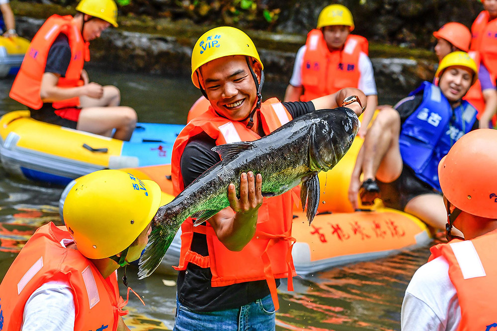 2019年8月2日,游客在广东清远一景区的漂流河道内捕鱼。连日来,台风“韦帕”给广东带来了大量降雨,全省各地江河水库水位上涨。