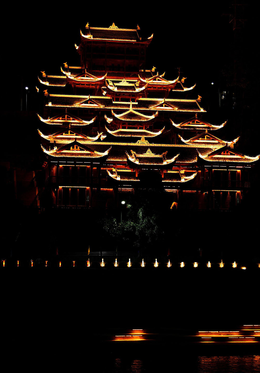 2019年8月2日晚,湖北恩施宣恩县城贡水河畔高达38.5米的木质“土司楼”首次亮灯并对游客开放。