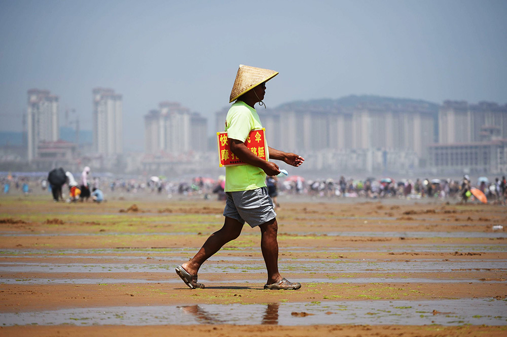 2019年8月3日,山东省青岛市,人们在海滩上玩耍。