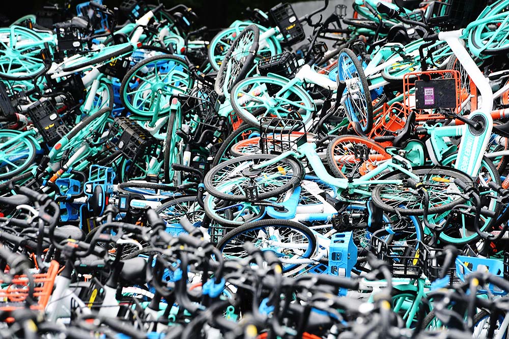 2019年8月3日,在沈阳市铁西区森林公园内的一处小院里,各色共享单车堆积如山,显得格外醒目。
