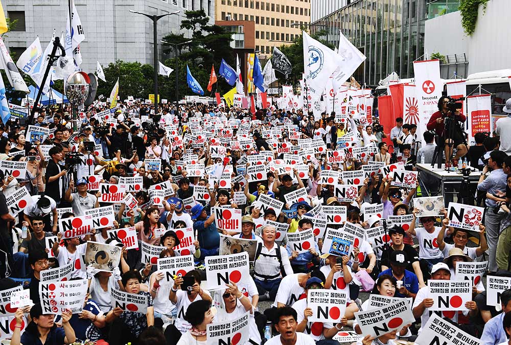 当地时间2019年8月3日,韩国民众当天在首尔市中心举行抗议集会,要求日本撤回“拉黑”韩国的决定。在现场,许多参加者举着写有“谴责安倍政权”的标语,口中喊着“不会输给日本,战斗到最后一刻”的口号。
