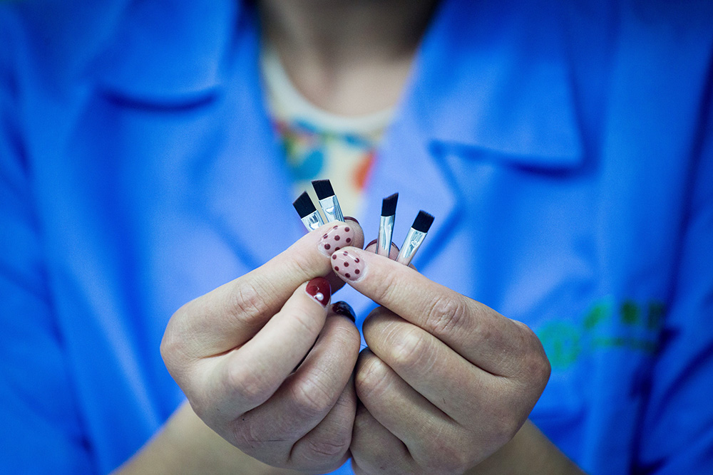 2019年8月5日,河南周口鹿邑。河南鹿邑县的化妆刷产业起于40年前,如今化妆刷远销美国等20多个国家和地区,年产值37.4亿元,化妆刷等尾毛产品年销量占全国的80%以上今年鹿邑县产业集聚区的新落地企业上了粉扑、彩妆蛋等生产线,鹿邑想要建成一个链条完整、配套完善、产研销一体的“百亿级”化妆刷产业特色集群,成为“中国化妆用具之乡”。图为工人生产的化妆毛刷。