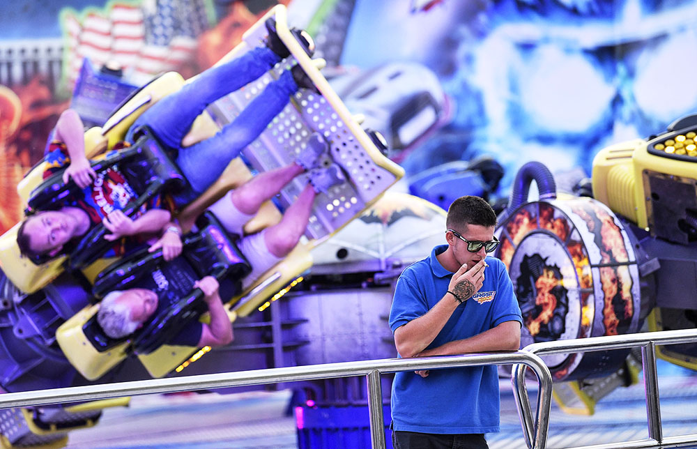 当地时间2019年8月5日,德国西部赫恩市,一个工人抽着烟,人们在传统的娱乐集市上享受乐趣。