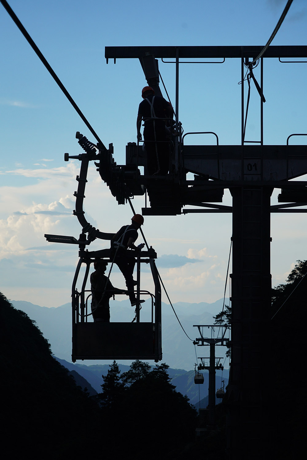 2019年8月6日,浙江丽水,龙泉山客运缆车索道,工人们从检修吊厢爬到了支架上。