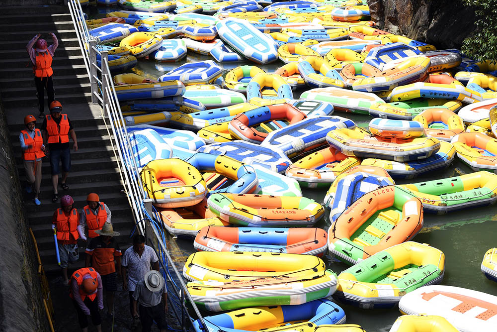 2019年8月6日,杭州,桐庐县钟山乡虎啸峡激流探险景区,游客准备坐橡皮艇开始漂流。