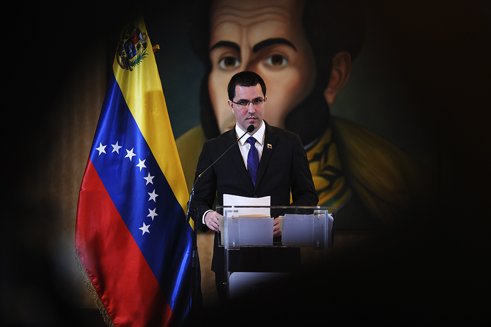 当地时间2019年8月6日,委内瑞拉加拉加斯,委内瑞拉外交部长豪尔赫·阿雷阿萨出席新闻发布会。美国政府8月5日发布一项行政命令,宣布对委内瑞拉政府实行经济禁运。委外交部回应说,美国的决定并不令人惊讶,新的制裁只是“将已经开始经济、金融和商业封锁正规化”。该国外交部还誓言称,决不允许“侵略升级”影响“政治对话进程”。