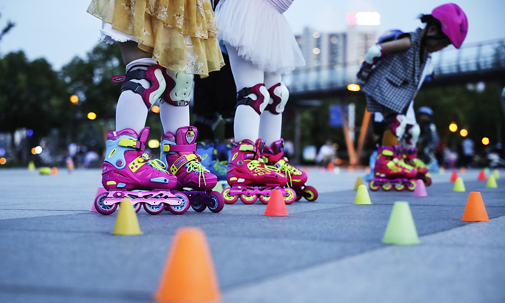 2019年8月8日,全民健身日,江苏淮安钵池山公园广场上学滑轮的小朋友。