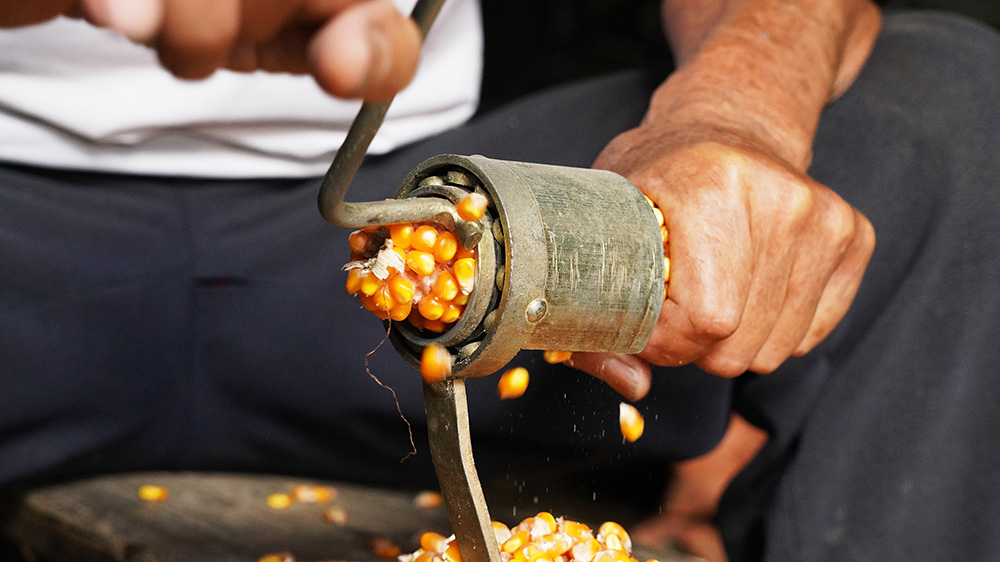 2019年8月8日,湖南怀化,在通道侗族自治县坪坦乡岭南村,村民在剥玉米。