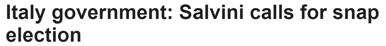 【意大利联盟党党首呼吁提前选举】意大利联盟党党首马泰奥•萨尔维尼呼吁提前举行选举,称与联盟各党派之间的分歧无法弥合。