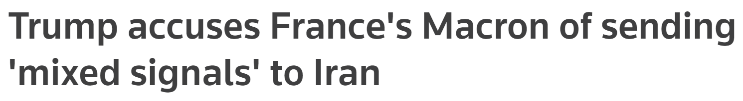 【特朗普指责马克龙向伊朗发出“混乱信号”】美国总统特朗普周四称,没有人被授权代表美国与伊朗对话。他指责法国总统马克龙就会谈可能向德黑兰发出了“混乱信号”。