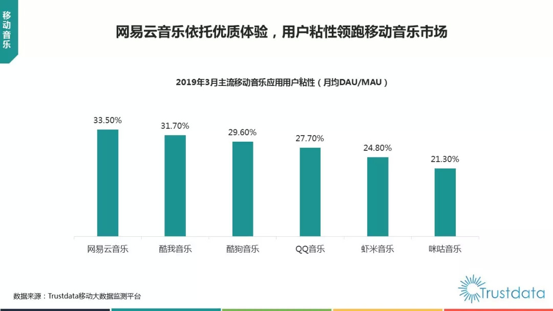 同时,网易云音乐的曲库使用率也高达80%,“能找到自己喜欢的小众音乐”是网易云音乐用户的重要诉求。Trustdata数据《2019年1季度中国移动互联网行业发展分析报告》显示,在移动音乐市场中,网易云音乐的用户粘性位33.5%,在行业内位居第一。