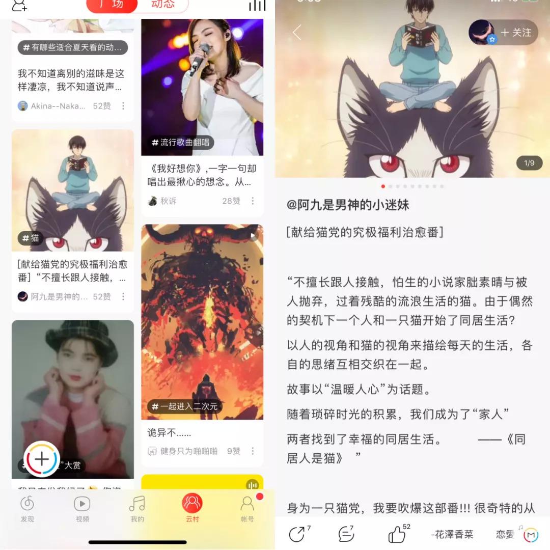 云村社区把传统“先看到歌,再看评论”的顺序做了个颠倒。用户在瀑布流中可以先看到分享图文,再选择感兴趣的点进去,听到对应的歌。翁家琪希望,云村社区可以补足“歌单安利”不够直观的短板,继续改变音乐探索和发现的形式。