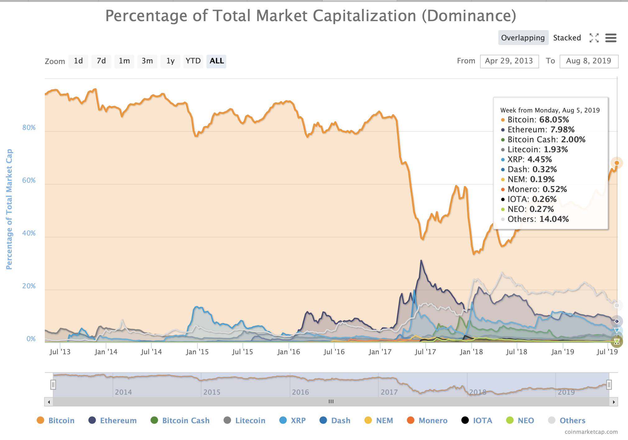 从那以后,除了几次短暂的波动外,以太坊的市场份额已经逐渐下降到目前的水平。熊市的几年,加上开发者缺乏有意义的更新,以及仍然没有改变世界的应用,导致投资者对以太坊的兴趣大幅下降。比特币,以及其他所谓的竞争币,是此次下跌的受益者。比特币的市值占比最近升至两年多来市场主导地位的最高点,截止发稿时已经达到69.1%。