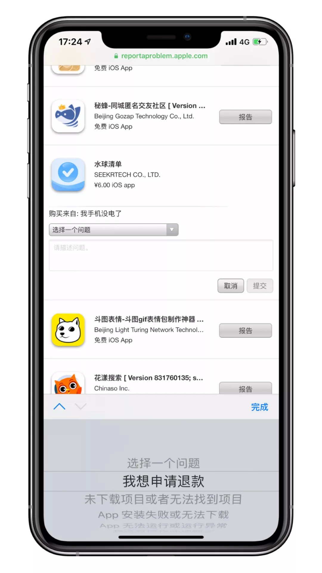 通过一系列安全认证之后,手机就会自动跳转到退款界面,然后差友们只要选择需要退款的 App ,填上理由等待苹果回复就好了~