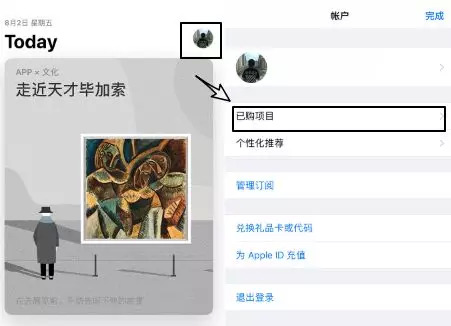 差友同样点击 App Store 右上角自己的小头像,然后在找到【 已购项目 】。