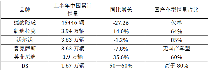 为难的是,驾仕派无法找到奇瑞路虎极光这款国产车型的销量,但从其上半年中国市场累计销量及跌幅来看,这个排名暂时第四的豪华品牌的国产化之路并不好走。