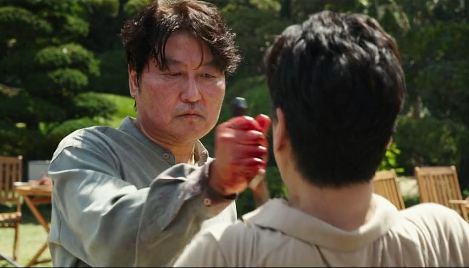 这时候,电影创作者将那扇隔离两个世界、维持平衡的门打开了,直接让观看者走入舞台,而不再停留在欲望和摹仿的位置上。在庭院这个舞台上,受宿主滋养已久的寄生者展开杀戮,维持已久的结构在此扭曲,最终旧寄生者杀死了部分新寄生者,宿主因再次对底层的气味表露出厌嫌而遭新寄生者杀害,旧寄生者也被反杀。维持秩序生产的幻象在这一刻破灭,我们像是在平静的日子里观看了一场爆破。