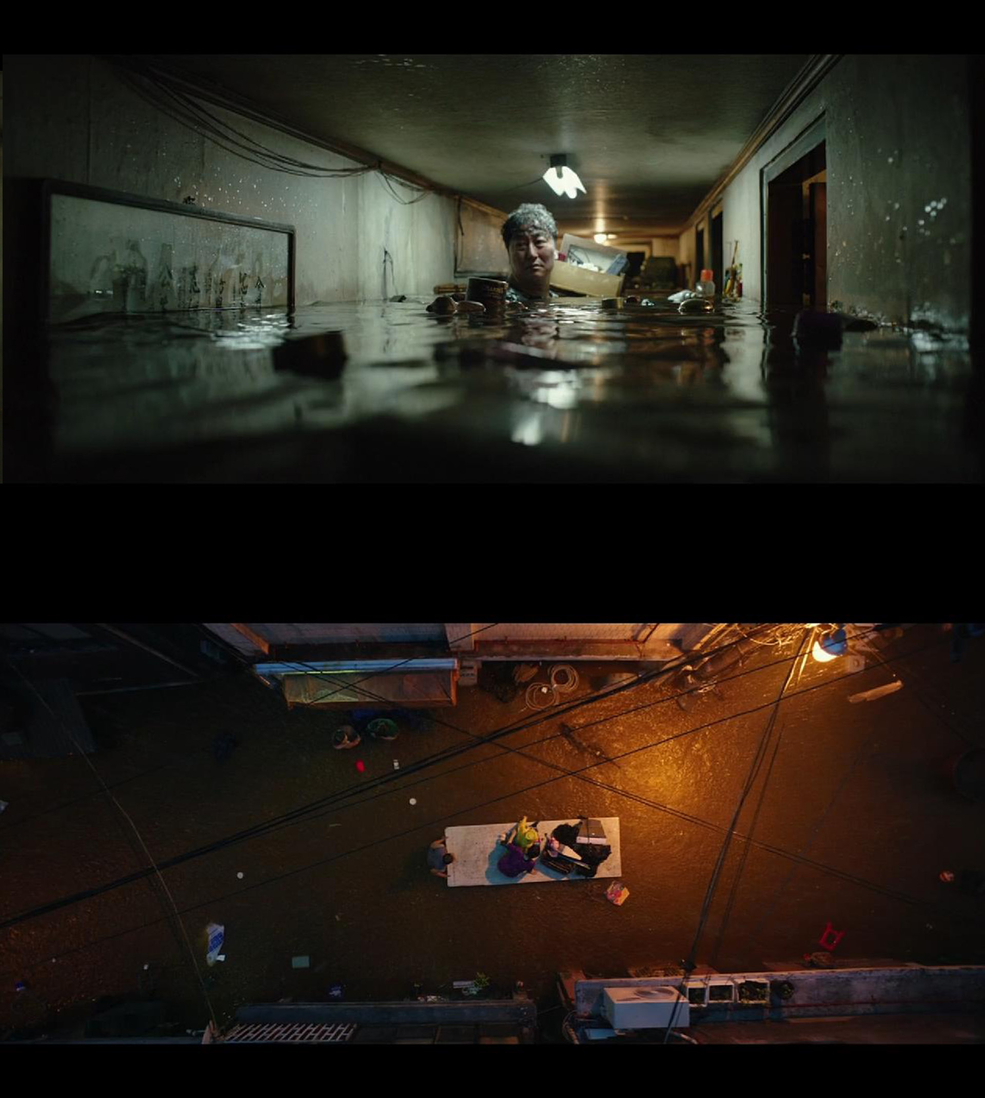 意外接踵而至,富人家庭因暴雨而取消露营,提前返家,这一家寄生者只得四处逃窜,像半夜开灯时四处逃窜的蟑螂一样,躲藏在宿主的视线之外,此时窗外的风景从美好的景观变成了危机——富人的小儿子在庭院里冒雨搭起了帐篷,他的父母在客厅的沙发上看护,寄生者就躲在客厅的茶几下面。窗外庭院景色再度回到了空间生产的秩序中,继续作为人造自然而存在,作为一件商品被观赏。不占有任何物的寄生家庭与它无关,他们根本没有掌控空间的能力,那风景屡屡提醒他们:只能观看,不能拥有。当他们返回自己居住的半地下室,暴雨与污水已将他们的家淹没——贫民及其生活空间在面对灾难时的脆弱令人心碎。