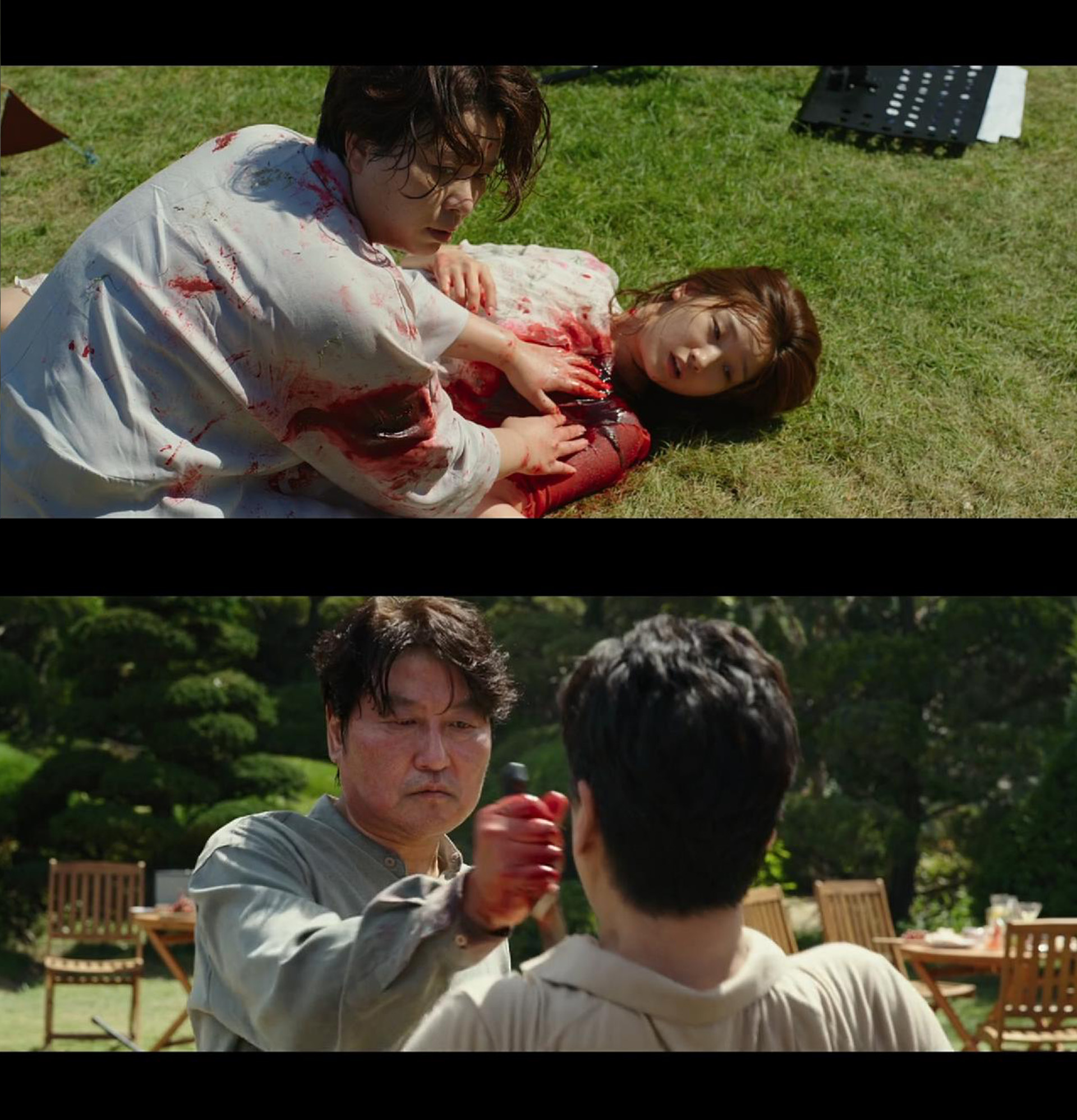 影片中杀与反杀的高潮部分与“幻象”密不可分。首先,这一切都根源于富人家庭小儿子的一场幻象:他半夜在厨房偷吃生日蛋糕时碰上了上来觅食的旧寄生者,认为是鬼并受惊晕厥。这一幻象由门所造成的区隔所生产和维持,而在高潮部分,“鬼”再次爬上来,挥刀闯入了小儿子的又一个生日。其次,正如前文所述,空间通过营造底层社会只可观看、无法掌握的景观,使得他们将幻象认作上流生活,促使他们不断去寄生和攫取,由此陷入欲望的捕获机制(capture apparatus)。在最后的生日宴会上,那片庭院成为了幻象生产和欲望运转的舞台。上流社会成员聚集于此加入展演,甚至主动参与幻象生产,引发观看者的欲望。