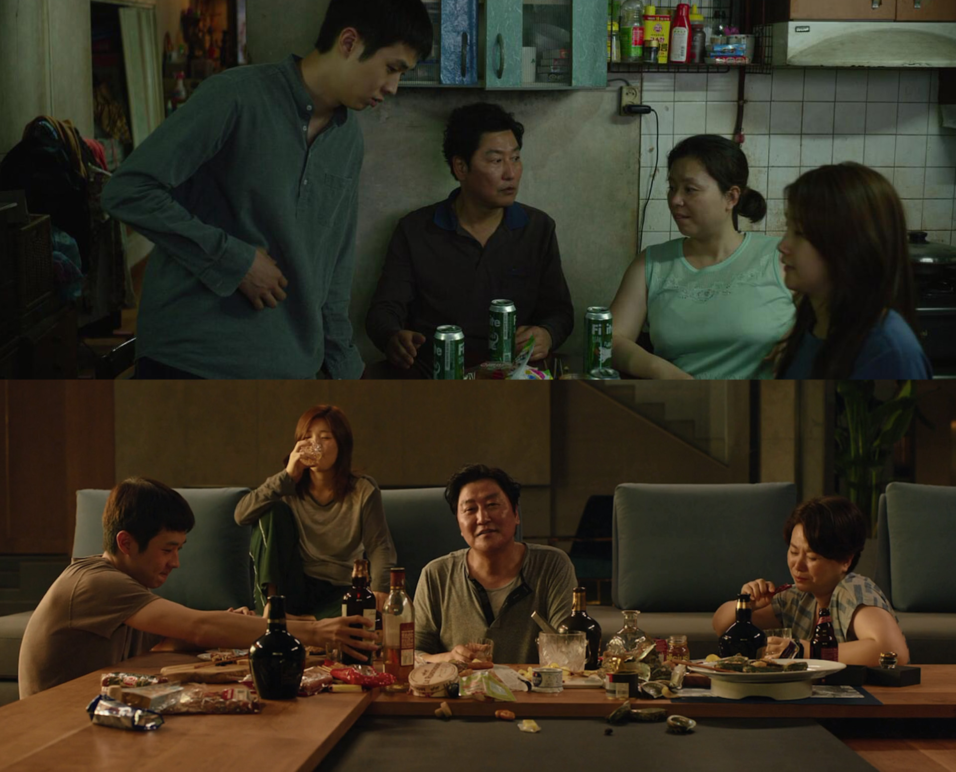 富人一家四口外出露营离开别墅,已成功寄生于此的这一家四口借此机会开始侵占他们的位置。从原来促狭围坐的圆桌和起身就要撞头的起居室,寄生者换到了开阔得可以并坐(甚至躺下)的宽敞客厅里,一同观赏富人家庭窗外的景色。父亲感慨道,在雨夜喝着酒,看着窗外庭院的雨景,十分舒适。