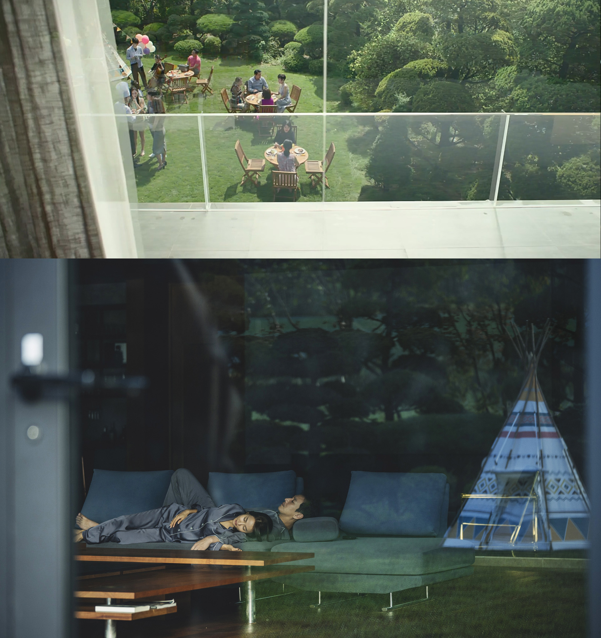 从奉俊昊的电影镜头来看,“庭院”被指认为了“舞台”。无论是模仿观看者的视角还是占有者的视角,电影都将整个落地窗及其包含的景色平置于摄影机和观众眼前,留出第四面墙的位置,以供代入观赏。寄生家庭在此观赏庭院中的自然景色——雷雨;富人家庭则将其用作小儿子模拟露营的场所,夫妇俩躺在沙发上盯着窗外的动静,待早晨来临,又去欣赏这被他们圈定的地界的景色。在此,“庭院”是提供幻象(“如果我们能够住在这里的话……”)的舞台,承担着观看者投来的目光和欲望,也是揭示欲望的路径——小儿子的露营愿望在此实现、夫妇凝望窗外嗅到底层气味而产生性欲,后来又变成了一次戏仿与刺杀的发生场所。