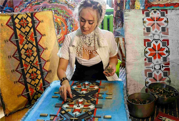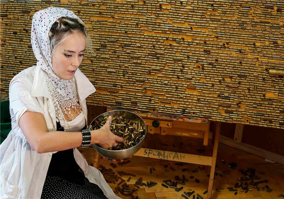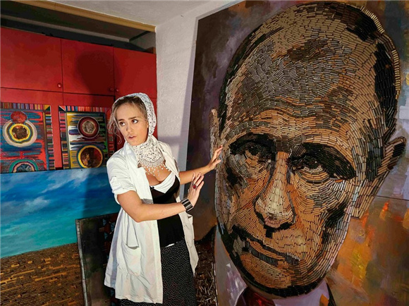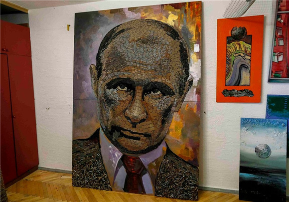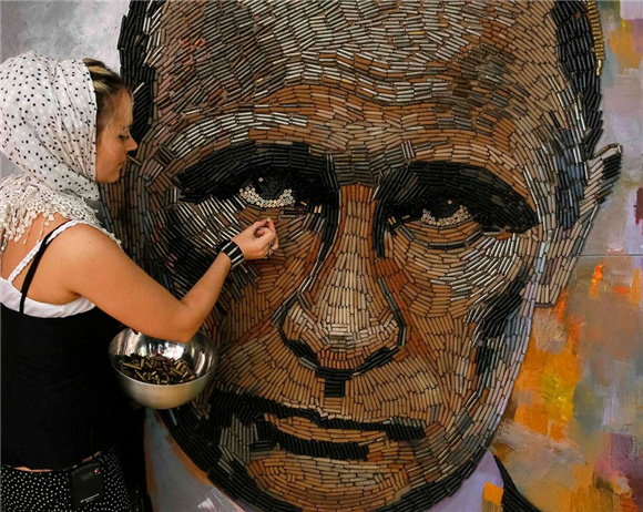 这幅普京肖像长2.4米,高1.7米,5000颗弹壳全部是从战火猛烈的乌克兰东部收集而来的。