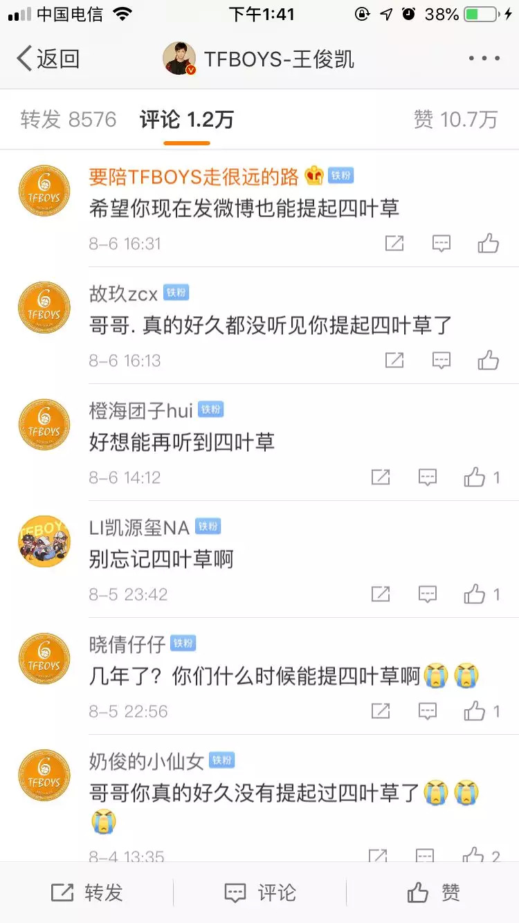 一位四叶草聊起“TFBOYS 解散了怎么办”时表示:“我就从此不混娱乐圈了,任何一个人都不粉了,这太难受了。”