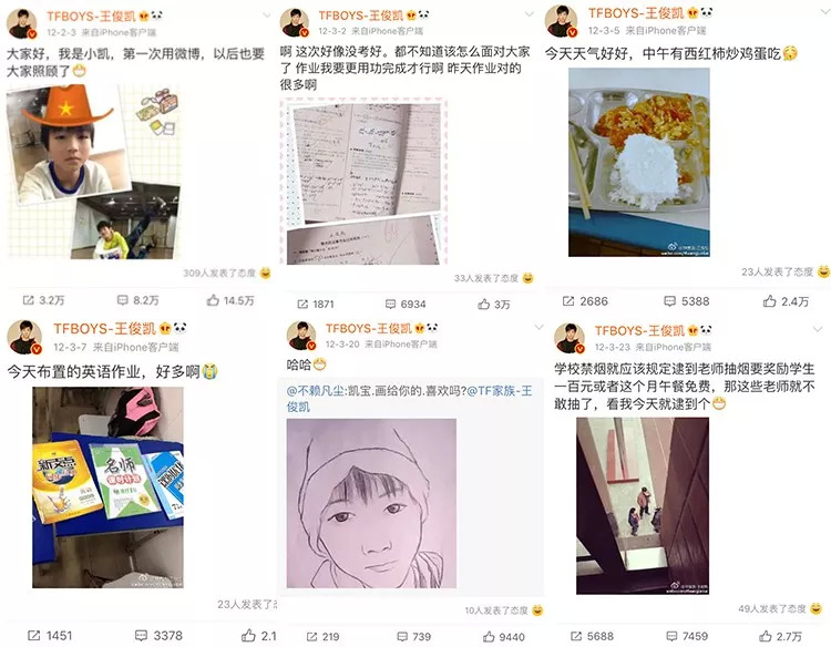 回顾王俊凯的早期微博,内容都是自己的日常,上学、作业、受伤、饮食,这些生活化的场景像极了今天一个孩子发朋友圈,没有套路更显真诚,更加让用户感觉到亲切和可触达。