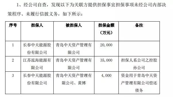 另外,相关公告显示2017年8月24日,中天资产与平安信托签订了贷款合同,平安信托为其提供3.5亿元借款,中天能源时任实控人邓天洲、黄博提供连带担保。但此后因流动性危机,中天资产无法按期归还借款。经双方协商,中天资产和平安信托于2018年9月24日签署展期协议,展期时间12个月,中天能源控股子公司江苏泓海出具《承诺函》,为本次展期贷款追加担保。