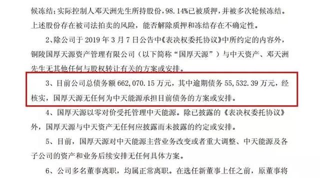 据2019年3月8日的一份公告显示,截至当时中天能源债务总额为66.20亿元,其中逾期5.55亿元。